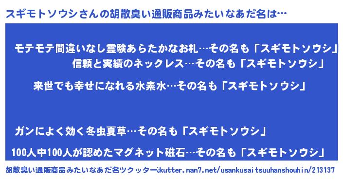 | 男性向けラノベタイトル風あだ名 | 『転生したらスギモトソウシだった件』 |