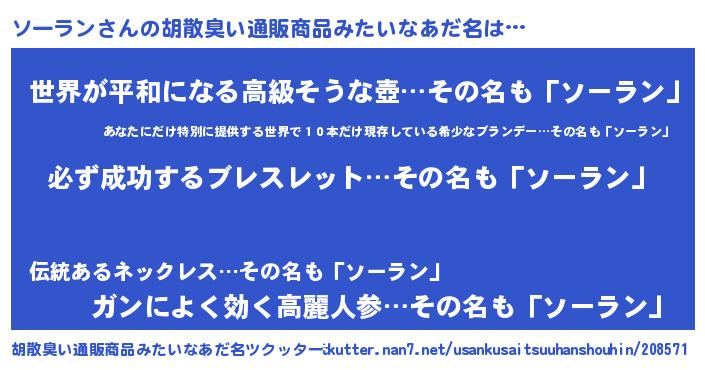 | 男性向けラノベタイトル風あだ名 | 『ソーランの憂鬱』『魔弾の王とソーラン』 |