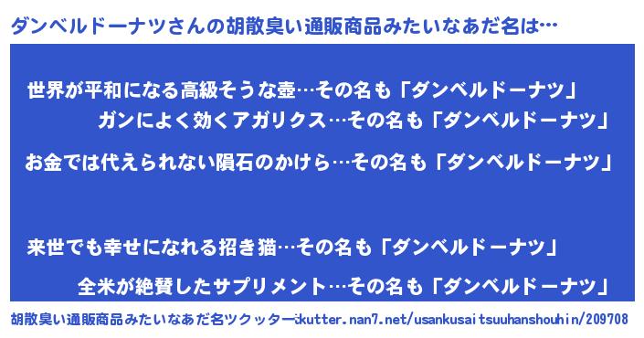 | 男性向けラノベタイトル風あだ名 | 『ダンベルドーナツに滅ぼされるだけの簡単なお仕事です』 |