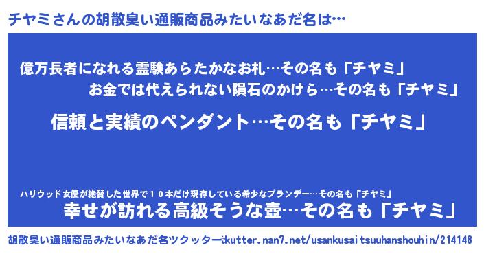 | 男性向けラノベタイトル風あだ名 | 『チヤミスレイヤー』 |