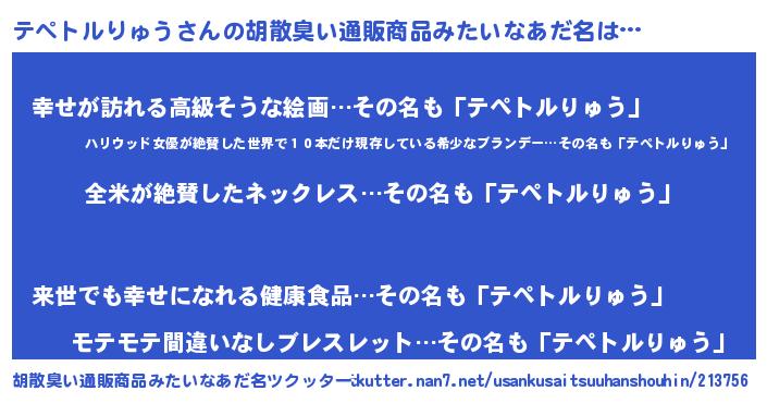 | 男性向けラノベタイトル風あだ名 | 『テペトルりゅうの嫁は女の子じゃないと思った?』 |
