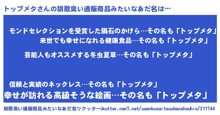 | 意味不明あだ名 | 『自称トップメタ』『永久保存トップメタ』 |