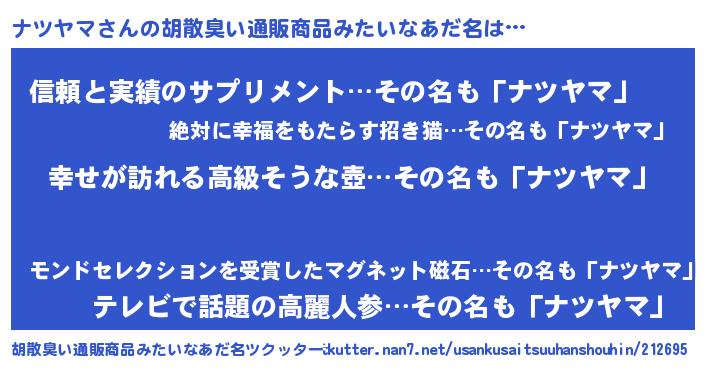 | 女子向けラノベタイトル風あだ名 | 『ナツヤマの雑貨屋さん』『闇のナツヤマ』 |