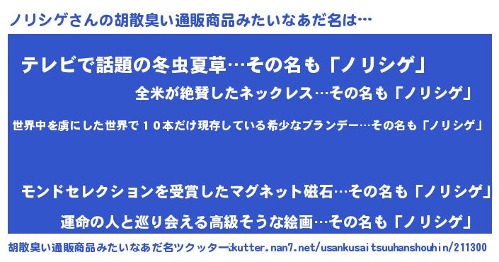 | 意味不明あだ名 | 『住所不定無職ノリシゲ(89歳)』 |