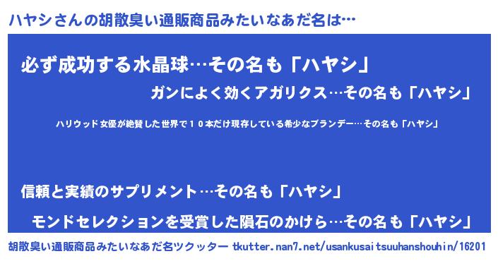 | 男性向けラノベタイトル風あだ名 | 『ハヤシスレイヤー』『魔弾の王とハヤシ』 |