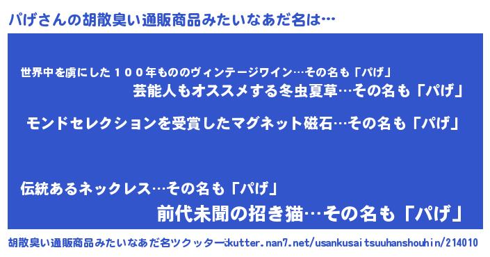 | ヒーロー風カッコイイあだ名 | 『天空の使者パげ』『仮面パゲダー』 |