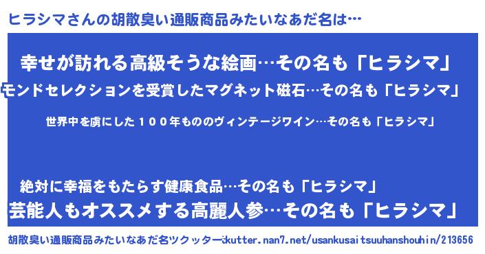 | ヘコむあだ名 | 『豆乳』『ヒラシマ(笑)』『ヒラにー』 |