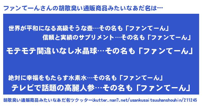| 男性向けラノベタイトル風あだ名 | 『ファンてーんの憂鬱』 |