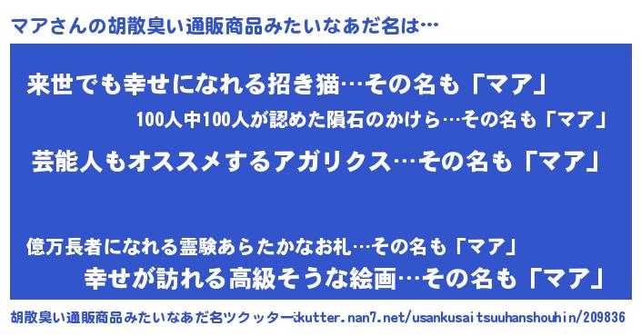 | 男性向けラノベタイトル風あだ名 | 『Re:マアから始める異世界生活』 |