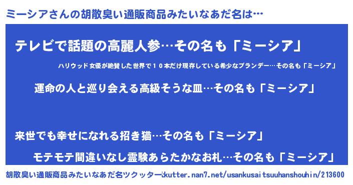 | 意味不明あだ名 | 『ミーシアフォーエバー』『自称ミーシア』 |