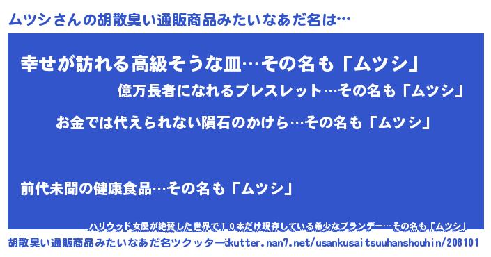 | 女子向けラノベタイトル風あだ名 | 『ムツシ恋絵巻』『ムツシの婚約者』 |