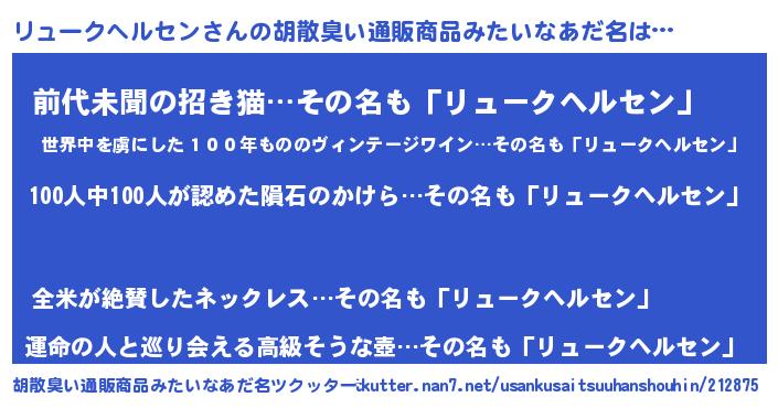 | ヘコむあだ名 | 『リュークヘルセン(遠い目)』『牛乳』 |