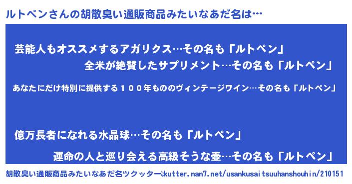 | 意味不明あだ名 | 『住所不定無職ルトペン(10歳)』 |