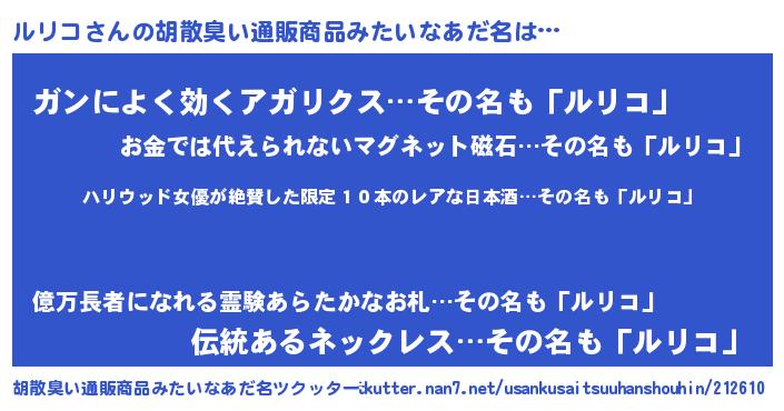 | ピコ太郎風あだ名 | 『ルリ史郎』『ルル太郎』『ルコ八郎』 |