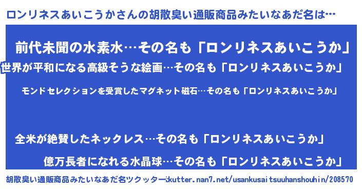 | 男性向けラノベタイトル風あだ名 | 『うちのロンリネスあいこうかが世界を掌握している!』 |
