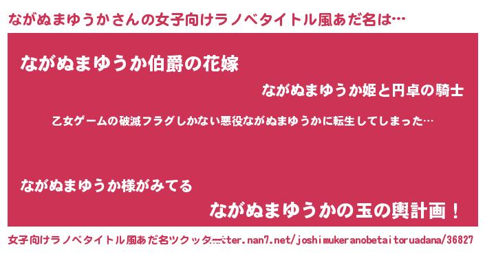 | 女子向けラノベタイトル風あだ名 | 『乙女ゲームの破滅フラグしかない悪役ながぬまゆうかに転生してしまった…』 |